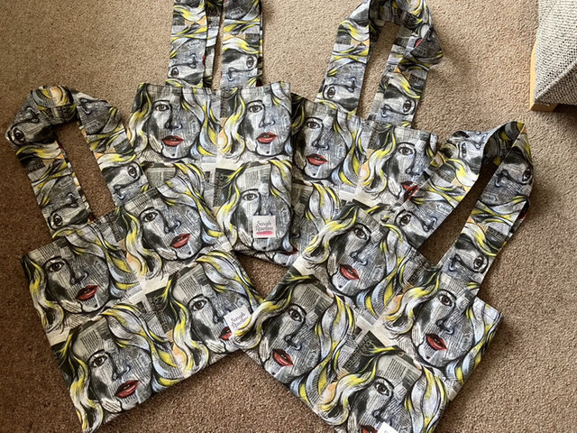 A fully lined, hand sewn tote bag with original Sarah Rawlins fabric design.